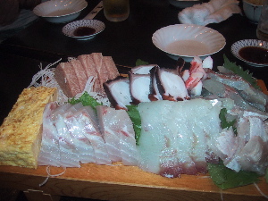 看板も出さず、暖簾もない。知る人ぞ知る新島一の銘店。地魚の刺身がよかった。尾長鯛は珍しいものだった。分厚い刺身は、普通の倍はあるね。ヒラメなんかは厚すぎて分からなかった。 注文によっては、主人が姿を消すことがある。どうしたのかなーと、尋ねてみた。港の生け簀に取りに行って来る、とのことだ。新鮮さは疑いよう がない。どうりで、ちょくちょく岸壁で出会った。