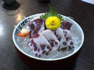 大島ではお刺身を青とうがらしで食べます 特に タカベ オアカ トビウオ サビ には ワサビ ではなく青唐辛子がよく合いますぜひ大島に来て味わってください 野菜、豆腐、塩なども、できるだけ大島産のものを使っています。 各種刺身 600円〜1000円というところ。 東京都大島町元町4-10-3 TEL04992-2-2942 伊豆大島元町港から徒歩10分、「どさん娘」のウラです。 電話・・・・・・・・(04992)2−2942 営業時間・・・・17時−23時 (オーダーストップは22時半です) 定休日・・・・・・日曜日です。 http://www2.ocn.ne.jp/~umisachi/ 再リンク6/3 |