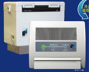 | 特徴 | *12V専用 *冷却水を冷媒に使用。 水を冷やすためには、「氷」もしくは「保冷剤」を用意する。 *送風部と冷却部をパイプで連結して冷却水を循環させる。 *排気管が不要 省電力 35W 40AHバッテリーで約12時間使用可 船外機使用のボートやキャンプなどのアウトドアに適する。 コンプレーサー不使用で、排気熱なし。 |