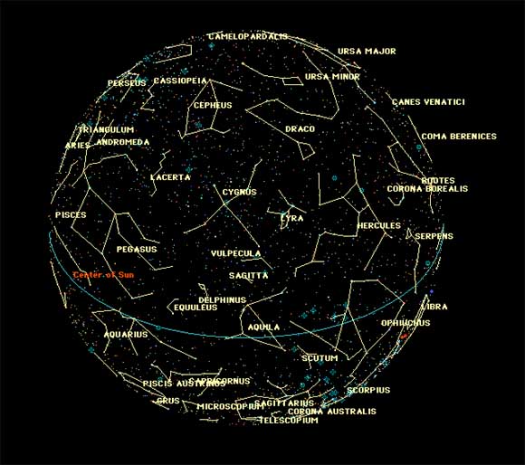 | 主な夏の星座と神話 黄色の文字には解説があります。クリックしてみて下さい。 |